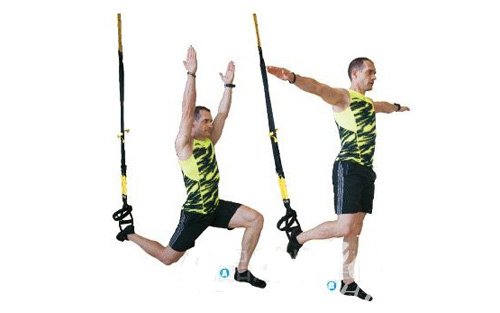 A.单脚穿过把手固定(注意悬挂脚要全程离地),另一条腿向前迈出一大步呈弓步。