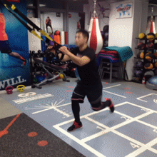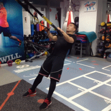 右手握紧手把,身体后倾加转体,左手指尖接触地面,然后上拉加转体,左手尽量向上伸展摸TRX的皮带。左右交换进行训练。