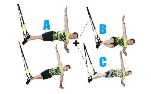 A.身体侧躺,双脚固定在套环中,一侧手臂手肘弯曲撑地。另一侧向上伸直打开。