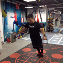 双腿分立,与肩同宽,双手握紧手把,做蹲跳动作,稍微后倾向上跳跃,起跳需要借助手臂的力量,跳跃在空中,身体要伸直,落地不要用全脚掌和脚跟,利用前脚掌做一定的缓冲,保护膝盖等全身的关节。每一次跳跃,都需要控制住身体平衡、跳跃的方向以及节奏。