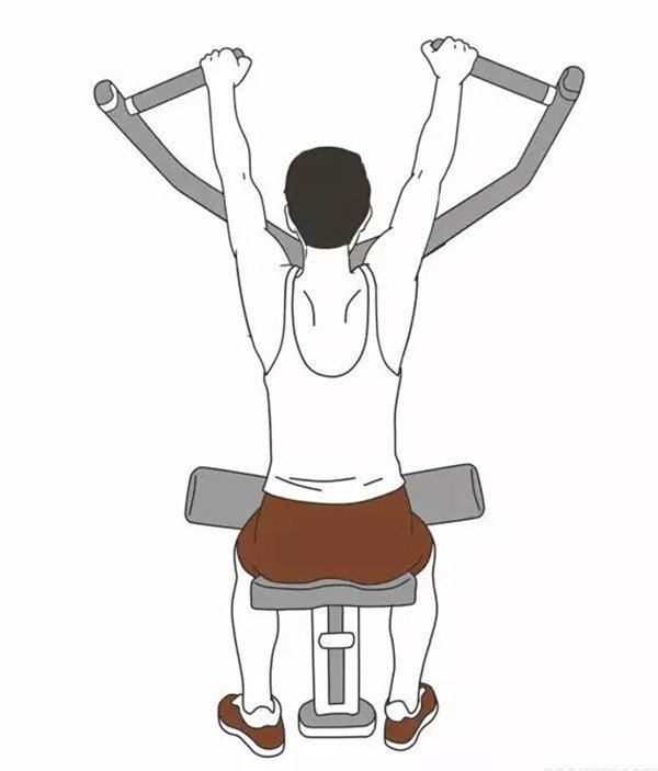 面向训练机坐下,双脚抵于挡板,身体向滑轮前倾,用力拉手柄至胸廓下部,挺胸,拉柄拉向身体同时肘部尽量向后,动作完成时呼气。训练背阔肌、大圆肌、三角肌。