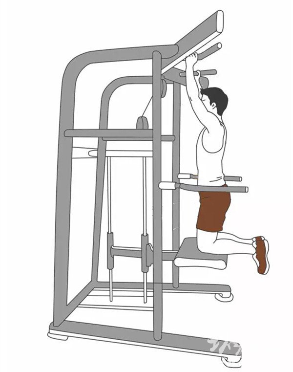 掌心相对双杠,两膝跪垫子,自然下垂。用背阔肌力量将身体往上拉起到双杠触及胸部。静止一秒然后吸气放松背阔肌,让身体徐徐下降直到完全下垂,重复再做。