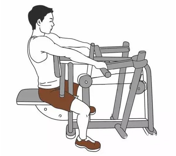 正坐座位挺直背部,双手抓住把柄,收腹沉肩,呼气时弯曲双手臂,同时手臂水平向后,拉至肩胛骨收紧时,停留2秒后手臂还原伸直,重复动作。