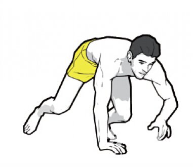 四肢着地,双臂伸展与肩同宽;双脚张开略宽于肩。右手右脚同时向前爬,接着换左手和左脚。向前爬行20米,转身,回到起始位置。