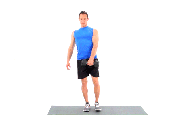 注意力放在着地的腿上,允许膝盖有些许的弯曲。把眼神固定在离你几英尺远的地方。让哑铃自然运动,手臂置于身体前方自然下垂。身体降至最低时,利用单腿发力恢复站立的姿势。先用左腿完成动作,然后第二轮用右腿完成动作。