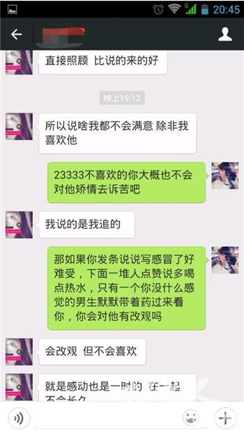 总结以上,当女生主动告诉你她不舒服时,也就等于表示好感。因为女生通常很烦自己不喜欢的人唧唧歪歪安慰自己。