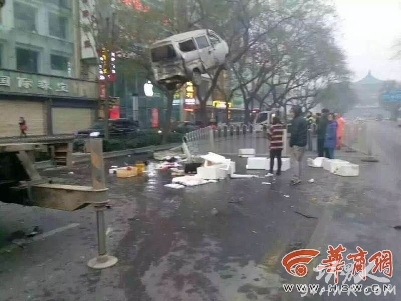 近日,很多人的朋友圈被一张面包车架在树杈上的图片刷爆,面包车咋可能冲到树上,真让人匪夷所思。也有不少人觉得图片是PS过的,肯定是假的。从图片上看,事发地点位于西安钟楼附近东大街上,其实图片是真的,事情也是真的,就是角度有那么一点邪乎。那么,事情真相到底是怎样?