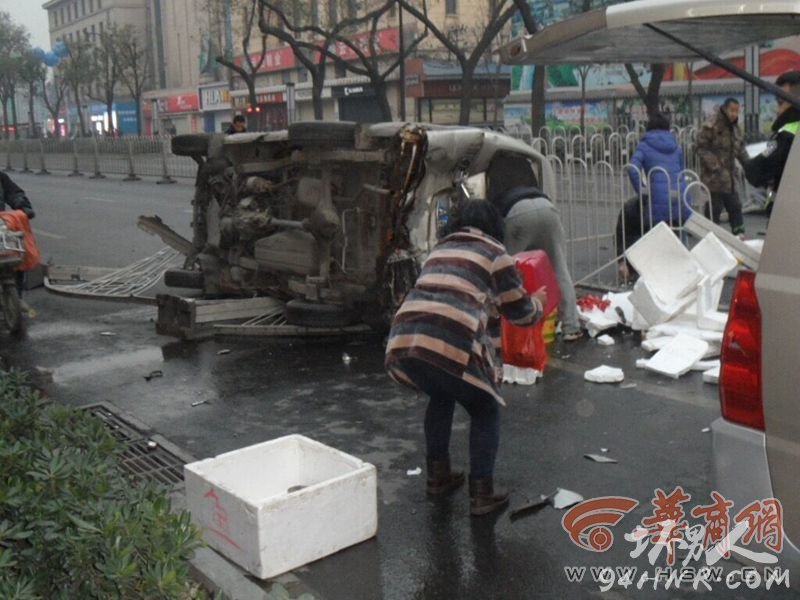 满载冷冻鱼虾的面包车撞上路中隔离栏后侧翻,大量鱼虾散落一地。据目击者孙先生介绍,面包车撞上隔离栏后侧翻,近20米的隔离栏被撞倒,面包车车身变形,车上数个装着冷冻鱼虾的塑料桶和泡沫箱子被甩出车厢,大量鱼虾散落一地。有路过行人见状,帮车主一同捡拾路面散落的鱼虾。