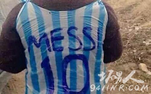 这个年轻的男孩被认为来自伊拉克战区,他使用蓝白相间的塑料袋,自制了一件阿根廷国家队的球衣,并在背后写上了梅西的名字和10号。