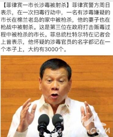 据当地媒体报道,总统杜特尔特早前曾点名道姓说这名市长涉嫌毒品走私。警方一直在对其实行布控监视。杜特尔特24日在国会发表年度国情咨文时表示,毒品是社会公害,是引发菲律宾各种刑事犯罪和造成家庭不幸的根源,同时破坏社会结构,妨碍外国投资,戕害青少年的身心健康。菲律宾政府将“坚持不懈、不遗余力地将反毒斗争进行下去”。