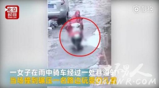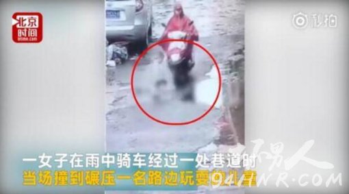 7月23日,披着红色雨衣的女子在雨中驾驶无号牌摩托经过一处巷道时,路边突然跑出一名儿童,该女子撞倒跑到路中间的儿童后,稍作停顿,从该儿童的身上碾过,摩托车明显有颠簸迹象。儿童的母亲赶过来将孩子抱起时,驾驶摩托车的女子头也不回,加速逃离现场。