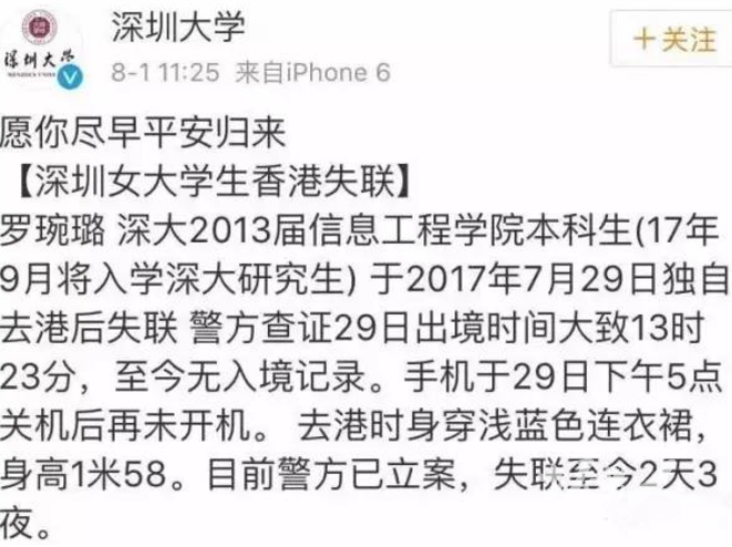 8月1日,一则寻人启事引起网友无数转发。@深圳大学官方微博发布消息称,深圳大学女大学生罗琬璐,上周六(29日)独自到香港后与家人及同学失联。警方查证29日出境时间大致为13时23分,至今无入境记录。罗琬璐的手机于29日下午5点关机后再未开机。