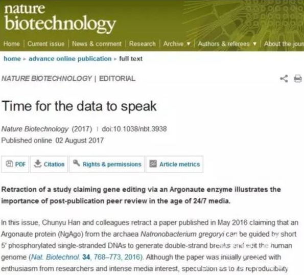 不到两个月后的2017年1月,《自然-生物技术》发言人发表声明,表示获得了与NgAgo系统可重复性相关的新数据,在决定是否采取进一步行动之前,需要调查研究这些数据。
