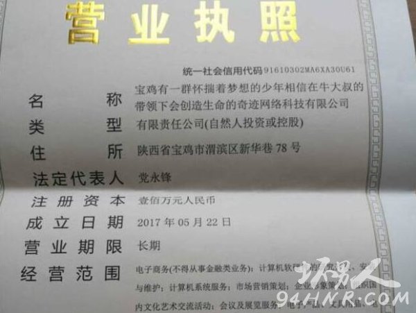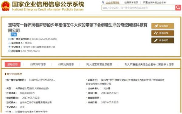 一家名为“宝鸡有一群怀揣着梦想的少年相信在牛大叔的带领下会创造生命的奇迹网络科技有限公司”的公司注册成立。(把名字打太多遍有凑字数的嫌疑,所以该公司以下简称“牛大叔”。