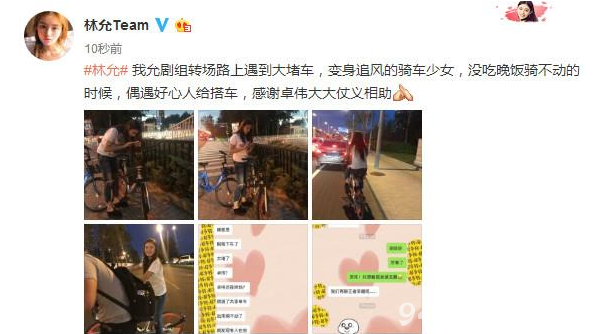 “我允剧组转场路上遇到大堵车,变身追风的骑车少女,没吃晚饭骑不动的时候,偶遇好心人给搭车,感谢卓伟大大仗义相助”工作室微博写道。看来林允这次转场还真是“一波三折”,不过好在后面遇到跟拍狗仔,还顺便搭了一下顺风车。