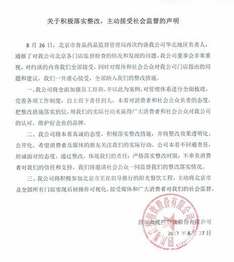 8月27日下午,海底捞官网发布《关于积极落实整改,主动接受社会监督的声明》。声明中称,对北京食药监局约谈内容全部接受,同时将媒体和社会公众指出的问题和建议,全部纳入整改措施。主动将全国所有门店实现后厨操作可视化。