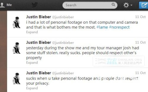 不久前小贾斯汀在Twitter上说自己非常不开心,因为他在华盛顿州开演唱会期间,个人笔记本电脑和手机都被偷了。他说里面有好多“私人照片”和“私人视频”,希望行窃的人能尊重他的隐私。