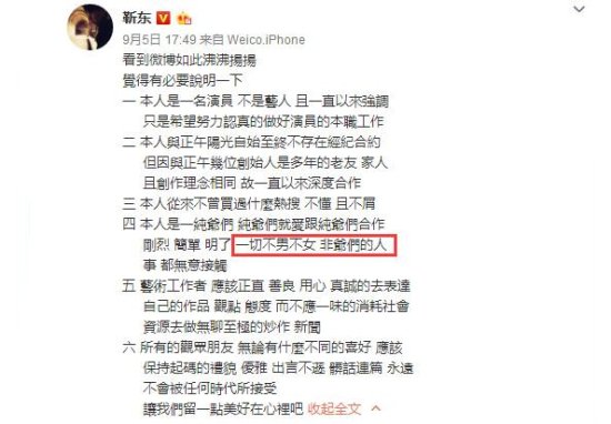 针对网络上关于他的一些争议性的报道和网友的激进言论,他表示:“本人是一纯爷们,纯爷们就爱跟纯爷们合作,刚烈、简单、明了,一切不男不女非爷们的人事,都无意接触。”