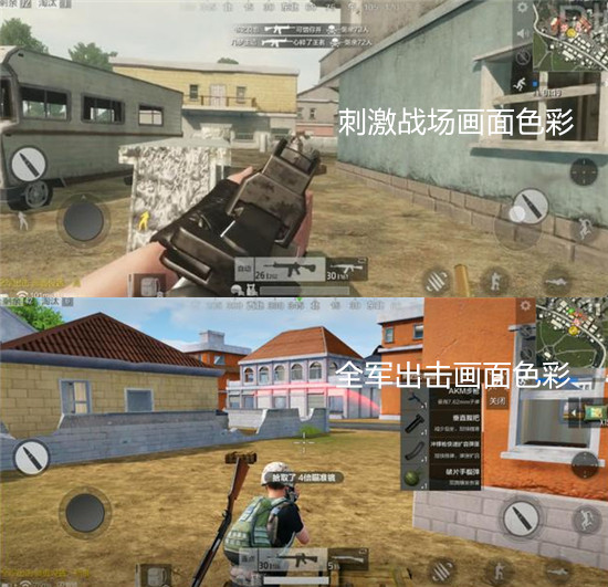 6、游戏中两款对比,《绝地求生:刺激战场》画面比较柔和,个人比较喜欢,而《绝地求生:全军出击》有点过于艳丽。