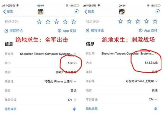 1、绝地求生:全军出击的游戏大小有1.3G,而绝地求生:刺激战场的游戏大小为843M。
