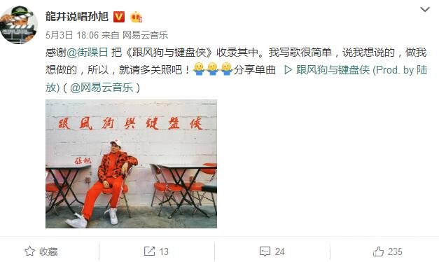 微博内容:感谢@街躁日 把《跟风狗与键盘侠》收录其中。我写歌很简单,说我想说的,做我想做的,所以,就请多关照吧!但是和这首歌一起收录的其他歌曲表示并不是他做的