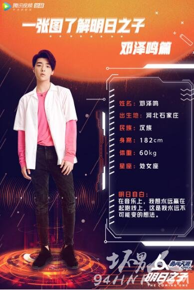 明日之子邓泽鸣,身高183 ,唱歌跳舞样样精通,多才多艺的男孩,在美国上学,超级宠粉 。明日之子第二季入围选手!