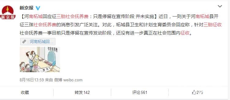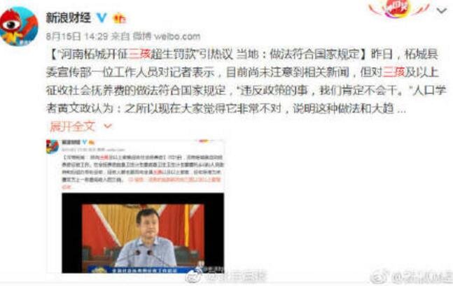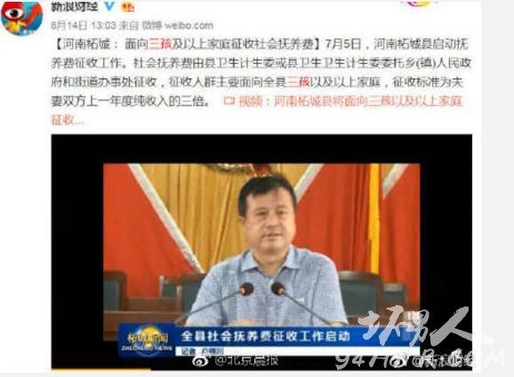 这两天,一则关于河南柘城县开征三孩社会抚养费的消息引发热议。河南柘城县公布的“社会抚养费”征收人群主要面向全县三孩以及以上家庭,征收标准为夫妻双方上一年度纯收入的三倍,可一次性缴清,如果经济能力有限,也可以分期缴付,但不可超过五年。记者粗略算了一下,如果是城镇户口,生三孩的家庭,需要花费近14万,农村也要6万多元。当地对此事回应称,做法符合国家规定,但目前只是停留在宣传发动阶段,尚未实施。专家称该政策滞后,违背公众意愿,多家媒体撰文批驳。