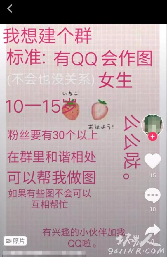 “史莱姆视频0.1元一个、假吃0.5元一个、吃播0.5元一个、男生女生头像各0.5元一个、壁纸0.5元一个、动态壁纸1元一个……要买的话可以加我或者合作伙伴可儿。”这是11岁女孩琪琪(化名)在抖音上发布的“广告”,地理位置显示她在武汉。