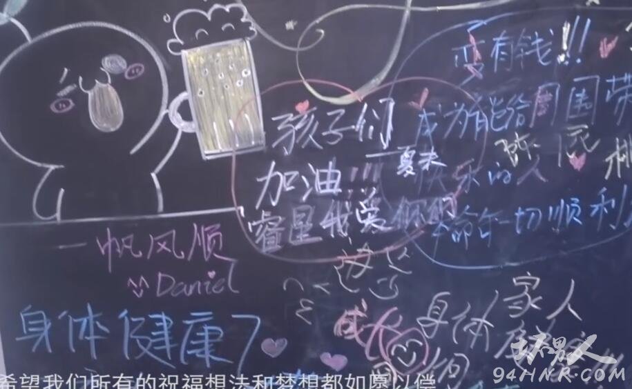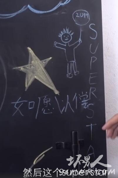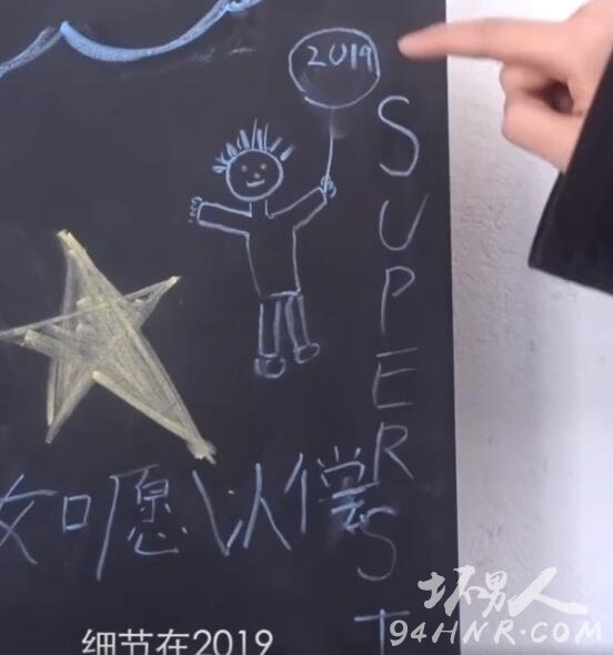 他说这个愿望墙在他来的时候几乎满了,而他就画了一些。图片上一个人拿着气球,希望2019年往上飞,就是要往前进的那种感觉,然后这个SUPER STAR ,然后祝福就是如愿以偿嘛,就是希望这个梦想能如愿以偿,希望我们所有的祝福想法和梦想都如愿以偿!
