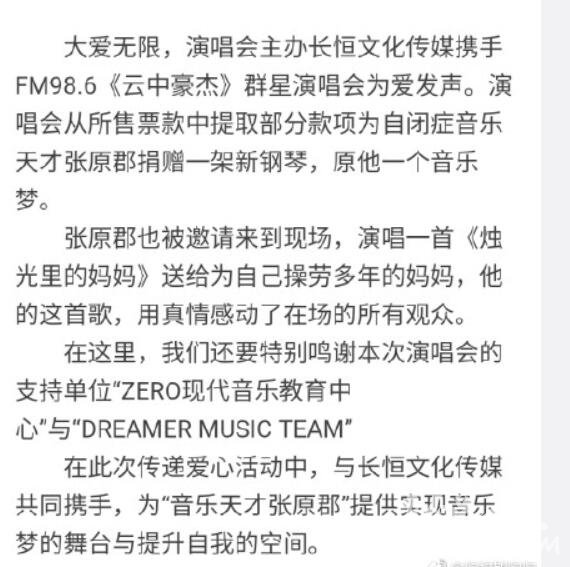 大爱无限《云中豪杰》群星演唱会为爱发声。演唱会从所售票款中提取部分款项为自闭症音乐天才张原郡捐赠一架新钢琴,原他一个音乐梦。他登台演唱《烛光里的妈妈》,让台下张原郡的母亲马晓秋女士潸然泪下,也让台下的观众为之感动。在这个寒冷的冬夜,张原郡的歌声让每个人的心中都无比温暖!