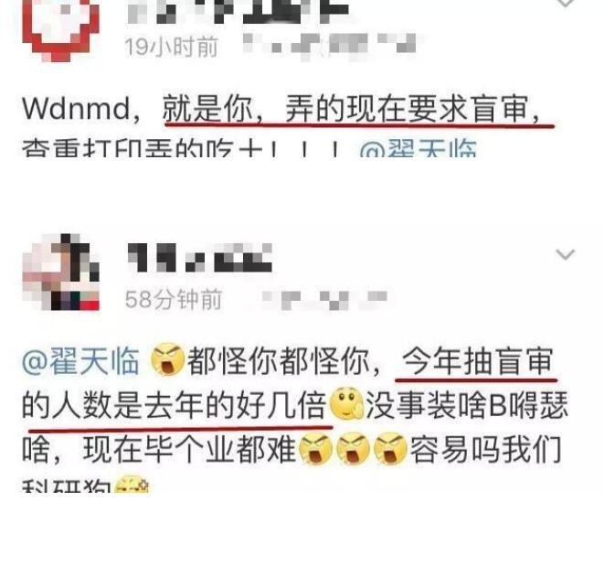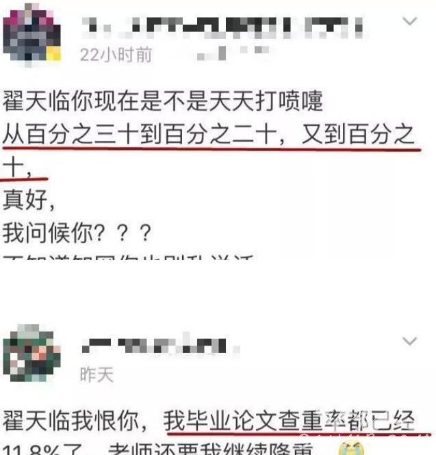 今年即将毕业的大学生们全都在网上疯狂吐槽翟天临,相关话题“翟天临 恨”中有诸多大学生表示因为翟天临论文事件,导致学校对论文重新查重,并且查重率还降低了不少,部分高校还实施盲审,这对即将毕业的学生们来说无疑是增加了很多麻烦。