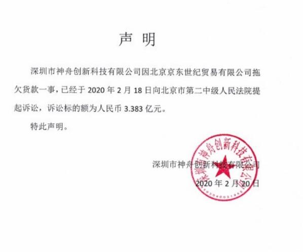 微博晒出的声明显示,深圳市神舟创新科技有限公司因北京京东世纪贸易有限公司拖欠货款一事,已经于2月18日向北京第二中级人民法院提起诉讼,诉讼标的额3.383亿元。
