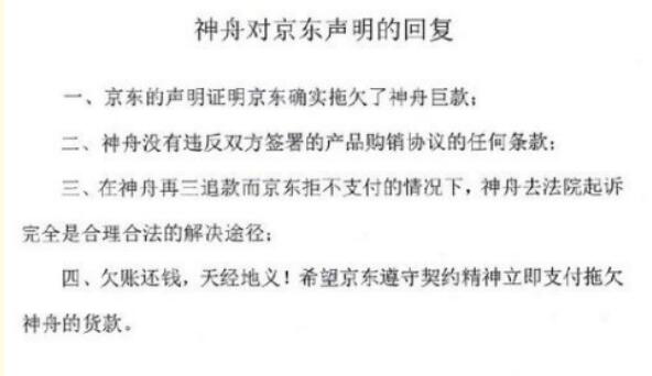 就京东方面的回应,神舟电脑20日晚再度发布微博,称京东的声明是其拖欠神舟款项的“实锤”。并表示神舟没有违反双方签署的产品销售协议的任何条款,在神舟再三追款而京东拒不支付的情况下,向法院起诉完全是合理合法的解决途径。