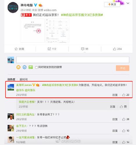 与此同时,神舟电脑董事长吴海军转发上述微博,并评论称:“欠账还钱,天经地义。我们正式起诉京东!”还在微博上@刘强东。