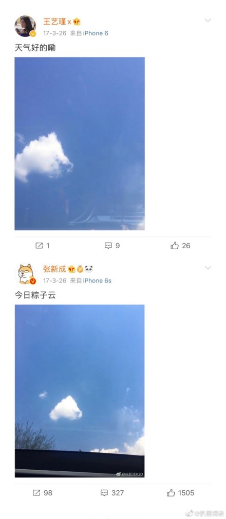 两个人17年3月同一天发了同一张云的形状。而且都是在车里面拍的,不会这么凑巧吧!