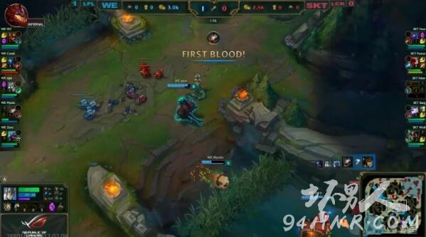 1分钟WE开F6!SKT进野区干扰!WE双人组躲在草里蹲到了!!SKT失误了!蛇女走得太深!被WE四人追上!蛇女交出双招!大嘴闪现拿到一血!!2分钟一血诞生!