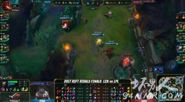 WE拿到下路一血塔,拿掉火龙。SKT打个时间差反掉下路一塔,WE在上路换一个一塔。一来二去WE不亏。