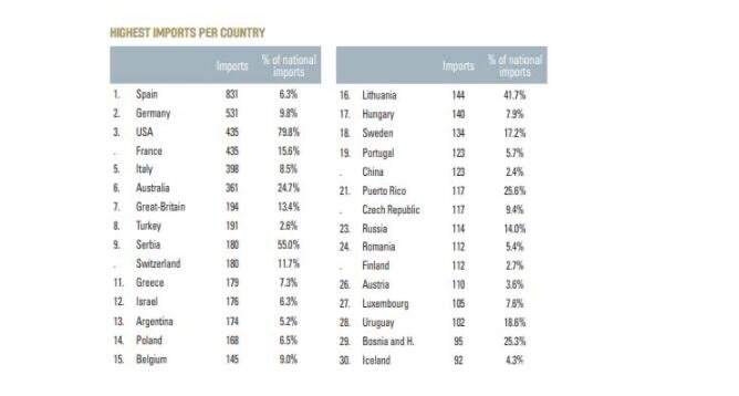 美国是篮球人才输出大国,上赛季他们一共为西班牙联赛输入了219名篮球人才,而西班牙的篮球人才输入到美国的数量仅有25名,这一输入和输出的人才总数是244名,高居世界第一,而美国为中国上赛季一共输入了54名篮球人才,中国为美国输入的篮球人才数量是42名,两个数量相加是96名,这一数量排名世界第6位。