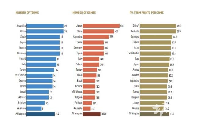 国际篮联还将上赛季各大联赛进行了对比,CBA联赛以20支参赛球队的数量和阿根廷联赛一道排名世界第1,西班牙、日本、法国和德国的联赛均以18支参赛队并列排在世界第2位。