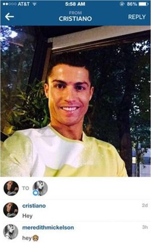 米克尔森把这张截图传到了社交网络,并写道:“不确定C罗约我这件事情是怎么发生的,但的确发生了。”C罗没有直接说“约吗?”,但根据美国的未成年人保护法,他的相关举动已经可以被认为是对未成年人的隔空骚扰,他也因此面临被处罚的危险。
