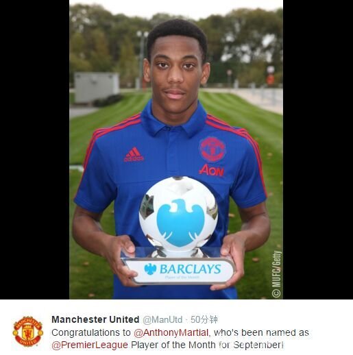 马夏尔登陆曼联后,九月份在对阵利物浦、南安普顿和桑德兰的3场英超联赛中打出惊艳表现,在这三场比赛中,法国小将一共打进3球并送出1次助攻,是球队取得三连胜的首功之臣。他也凭借这番出色的表现,击败了自己在曼联的队友布林德、沃特福德前锋伊加洛、热刺门将洛里斯、西汉姆中场帕耶特以及莱斯特城攻击手瓦尔迪,荣膺九月英超最佳球员。
