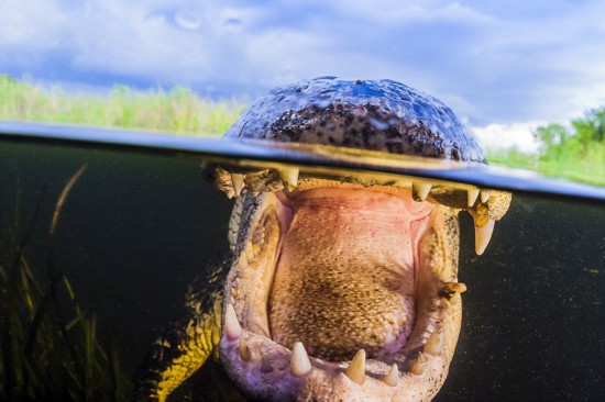 这种10英尺(约3.05米)长的庞然大物张开嘴时会露出锋利的牙齿和粉红色的舌头,且身上会呈现出新鲜水草反射出的亮黄色。在一个天气晴朗且湖水清澈的日子,43岁的摄影师Masa便潜入了水道,开始为鳄鱼们拍摄。他说:“我有幸得到了一位美国印度裔女士的指导和协助,她可以模仿鳄鱼的叫声,从而吸引鳄鱼靠近河岸。但同时,这也引发了另一个问题,即这些庞大的鳄鱼可能会因空间不足而发生碰撞,或彼此攻击。”在尝试与鳄鱼同游后,Masa指出,水下拍摄最好是在高地用竿式数码相机拍摄,这样才可以真实地反映水下景象。