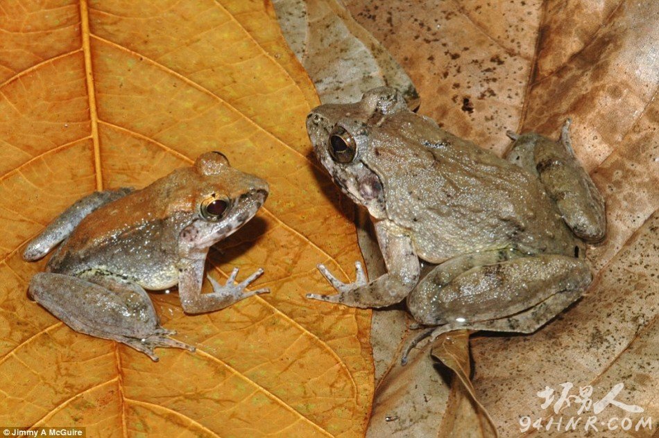 这是一只雄性的长尖牙青蛙,发现于印度尼西亚,旁边是一只刚出生不久的蝌蚪。长尖牙青蛙(Limnonectes larvaepartus)发现于印度尼西亚的苏拉威西岛。图中左边是雄性长尖牙青蛙,比右边的雌性小很多。与大部分两栖类物种不同,雌性长尖牙青蛙会直接产下蝌蚪,而不是产卵后再由雄性授精。