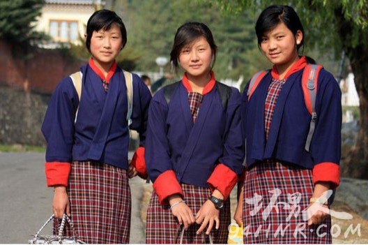 女生校服之最有特点:不丹。不丹学生的校服非常有特点。不过这宽大的校服到是让学生省了不少力:据说学生上学不用背书包,所有文具和书本都揣在怀里,衣服也变得更加鼓鼓囊囊的。