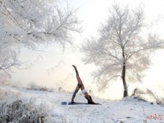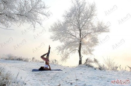 吉林女孩-30℃挑战冰雪瑜伽美图曝光 与江边的雾凇美景浑然一体。