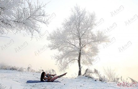 吉林女孩-30℃挑战冰雪瑜伽美图曝光 与江边的雾凇美景浑然一体。