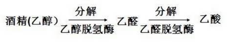 第一步,乙醇脱氢酶(ADH)把乙醇(酒精)变成乙醛。