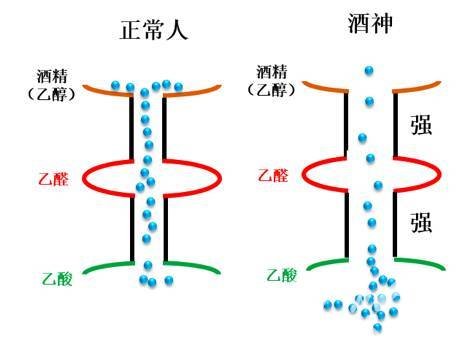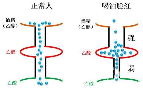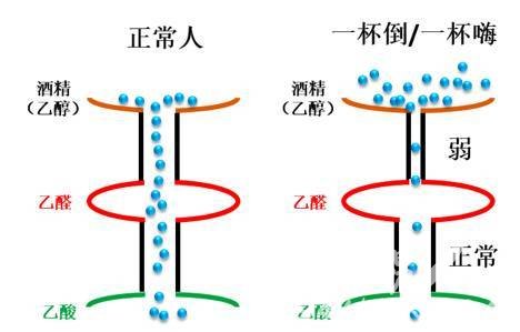 普通人喝酒后,乙醇正常分解为乙醛,再分解为乙酸,节奏差不多,因此乙醇和乙醛含量都不会积累太高。而很多中国人,前一步很强,后一步很弱,因此在乙醛那里形成瓶颈,于是就悲剧了。