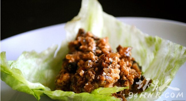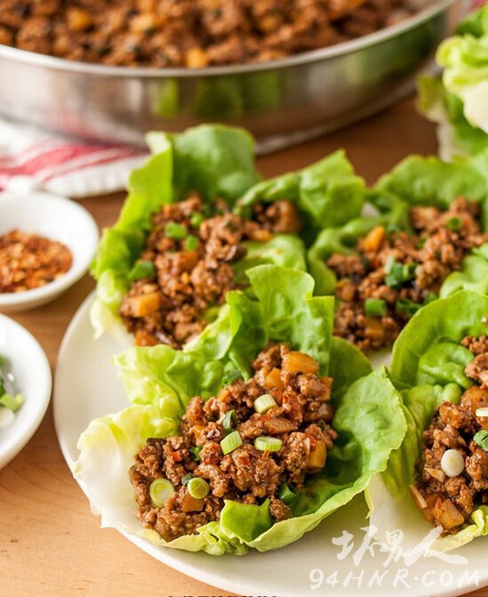 5.用奶油生菜包裹蘑菇鸡肉馅,撒一点葱花就可以吃了,小编建议在包一点白饭进去,味道更棒。