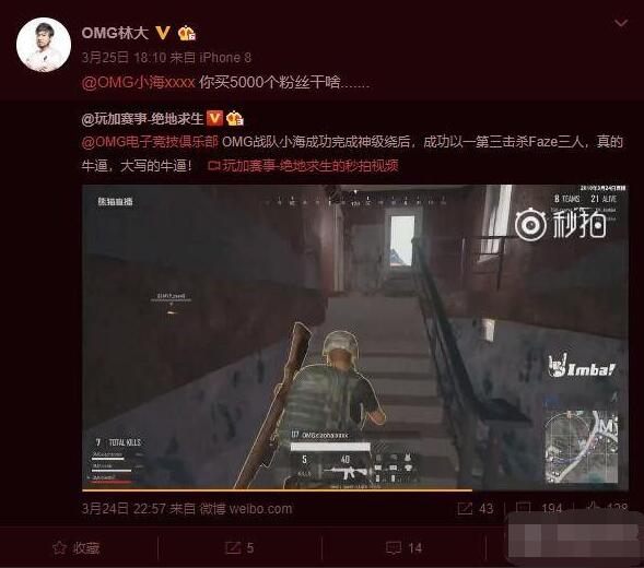 前两天,PGL罗马尼亚绝地求生国际邀请赛圆满结束,中国参赛队伍OMG在第三比赛日打出了惊艳成绩,包揽当日积分榜第一和人头榜第一,队员小海比赛中一波1V3灭队世界冠军FAZE更是圈粉无数,比赛刚打完就有不少粉丝跑到小海微博上询问起直播间了。